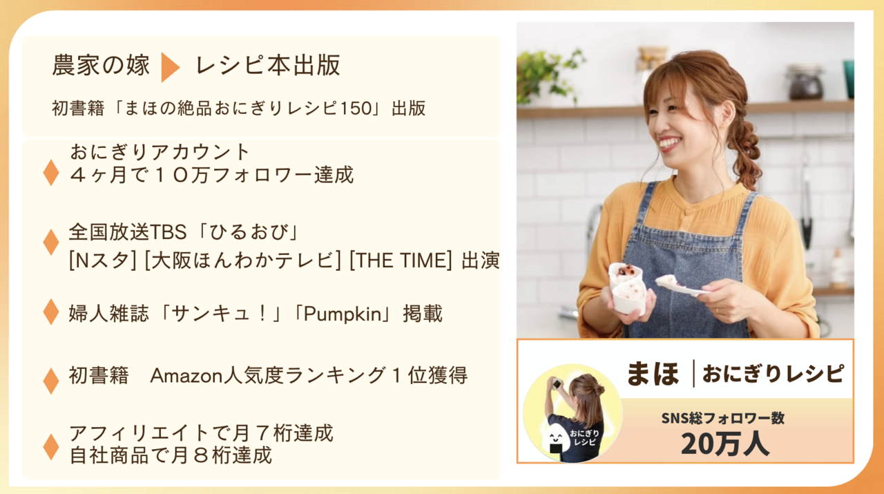 「料理」という巨大なジャンル(ビッグジャンル)の中で、「おにぎり」という特定のカテゴリー(ニッチ)に特化することで「おにぎりと言えばまほさん」という独自のポジションを確立されました。